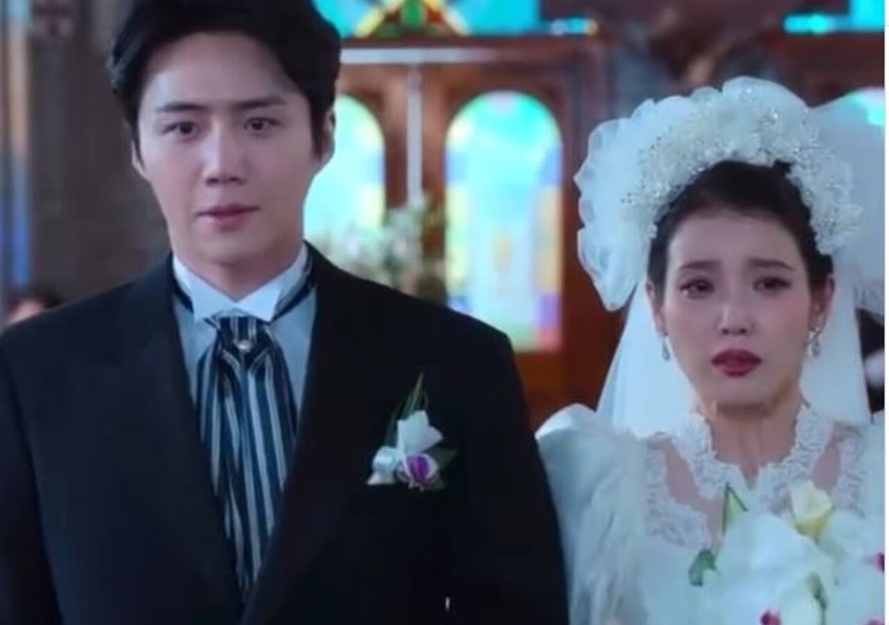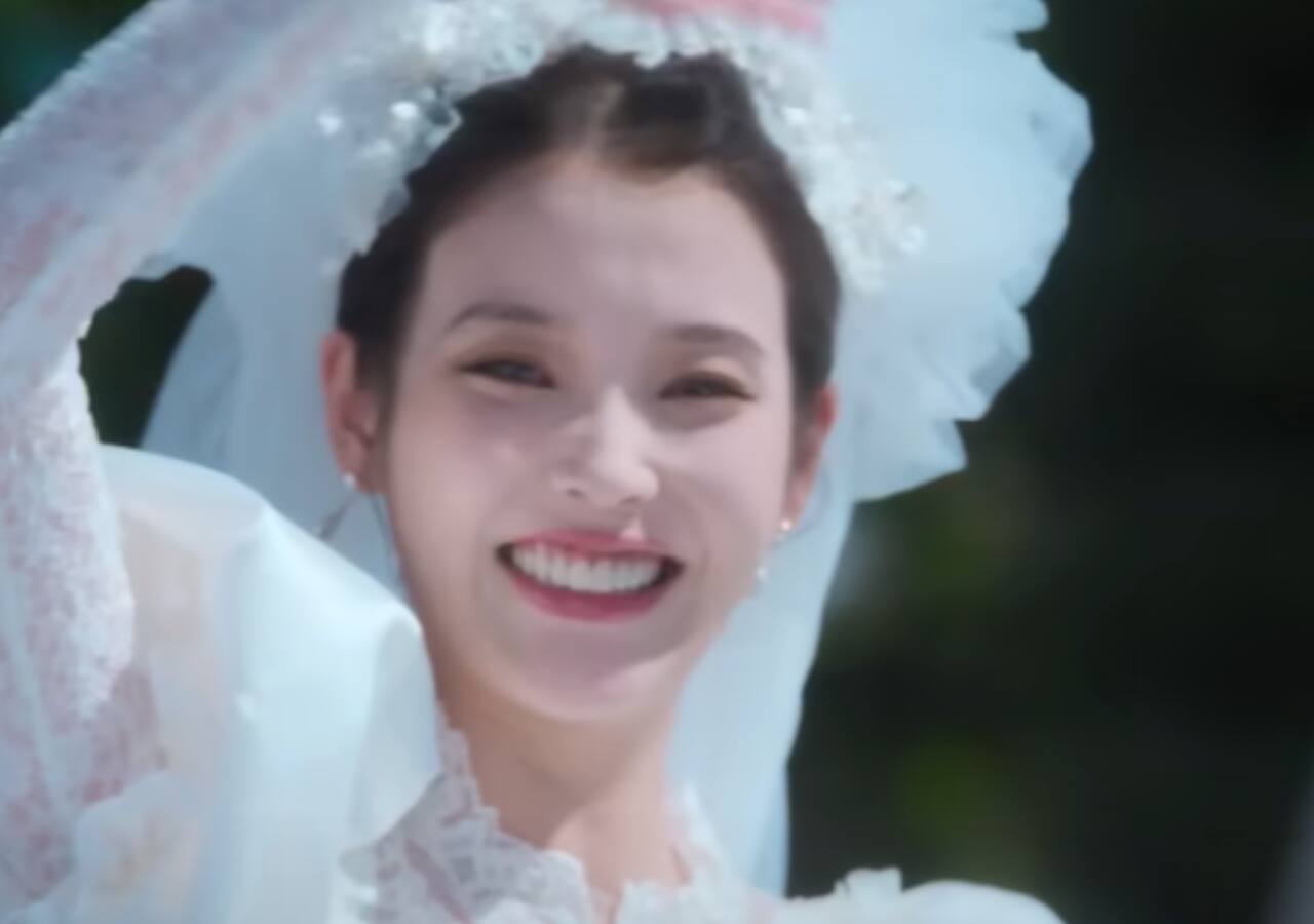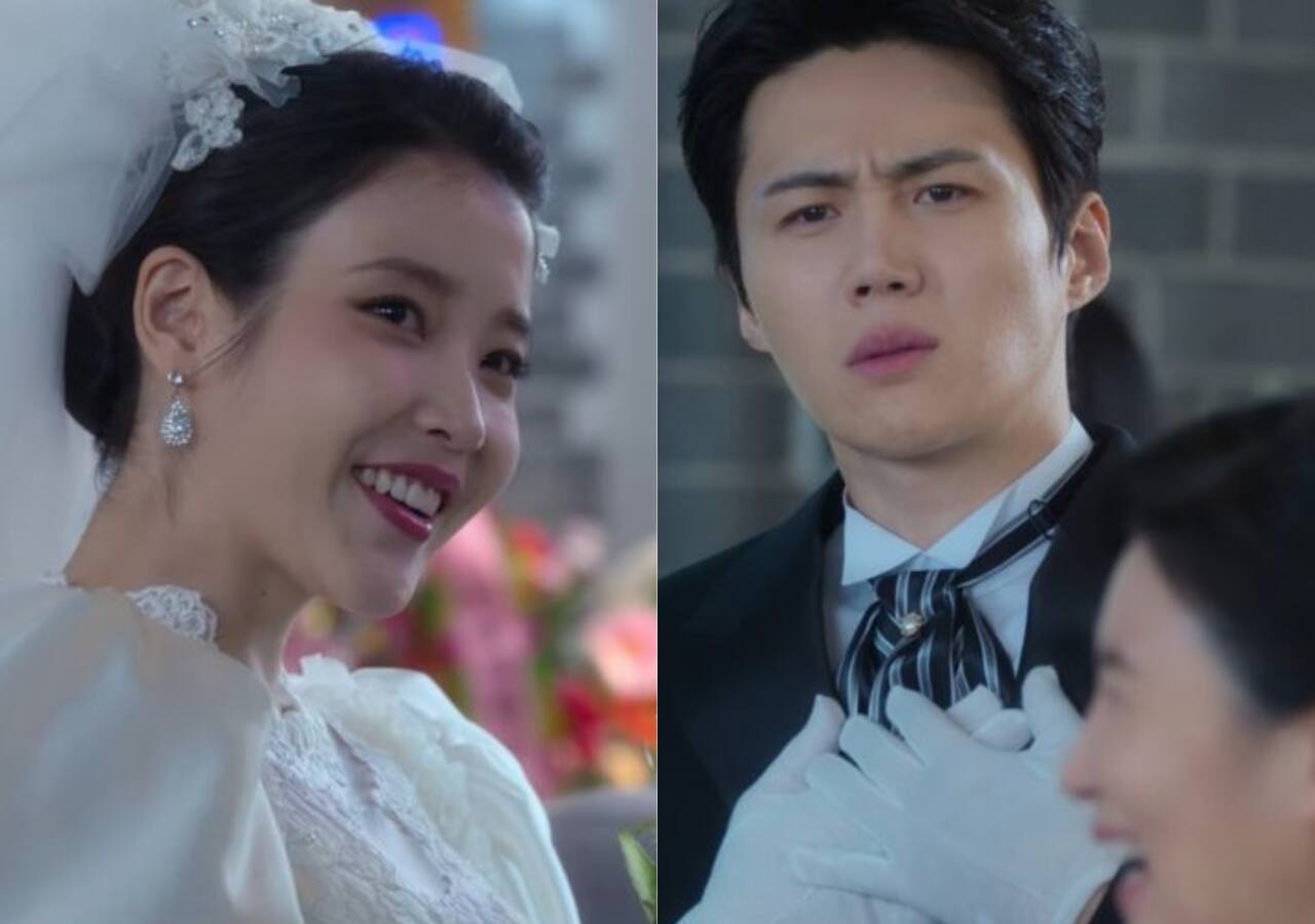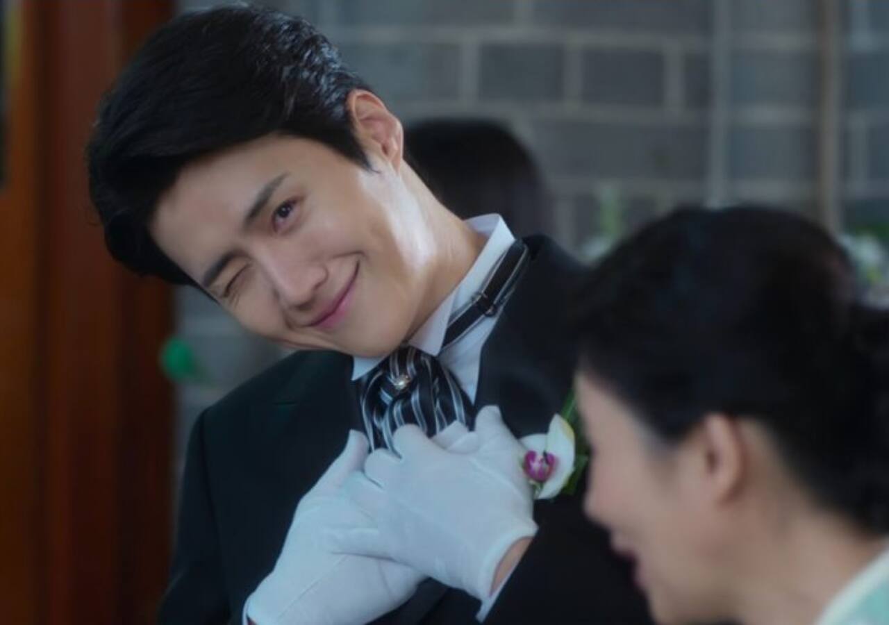 In the scene, Chung Seop is about to marry Geum Myeong, and the moment she walks into the wedding hall, he’s completely smitten. As their eyes meet, he tilts his head, smiles like he’s in a dream, winks at her, and even pretends to faint from the sheer beauty of it all. Geum Myeong, clearly flustered, hides behind her bouquet, while her father, Gwan Sik, quietly watches the whole thing.