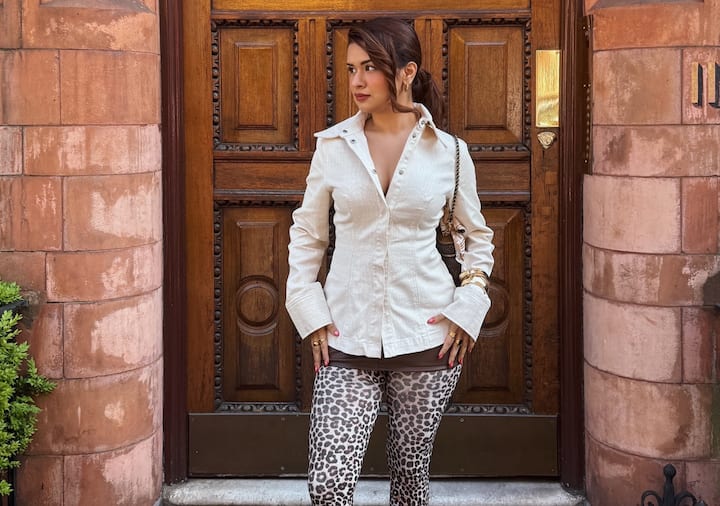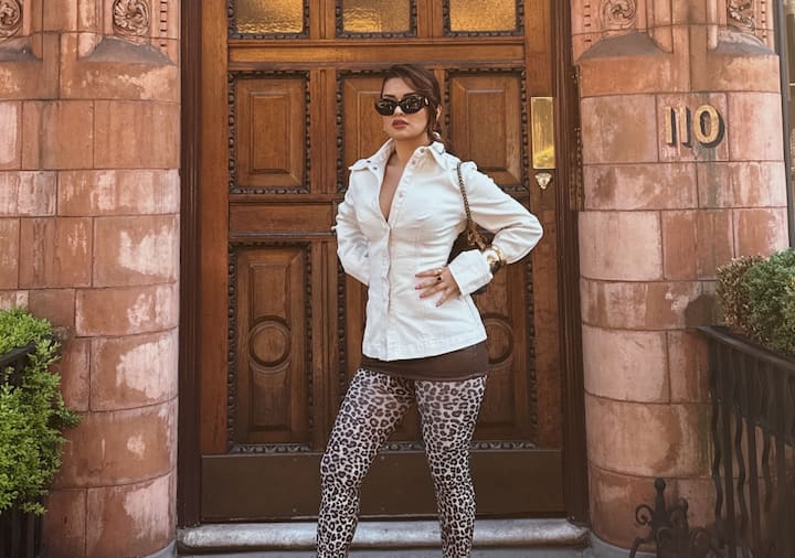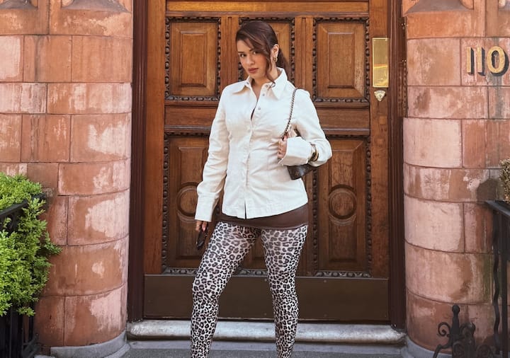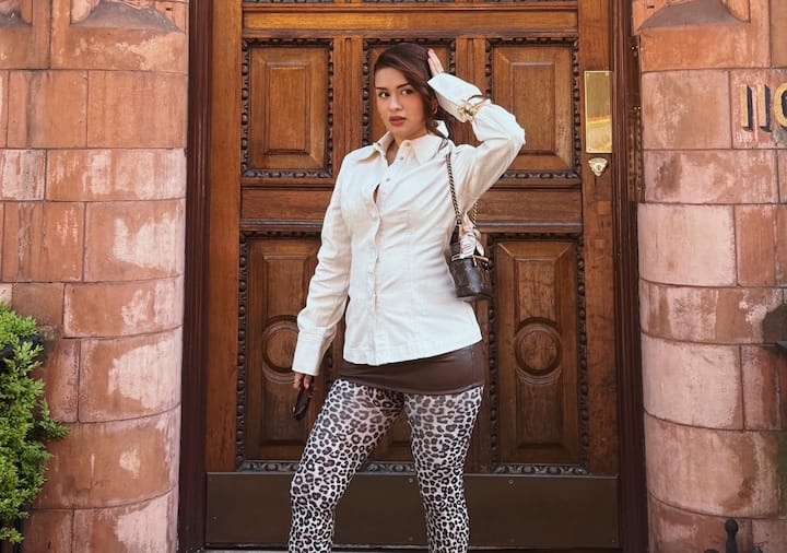 In the photo, she is seen wearing a light-colored, long-sleeved button-down shirt, which is layered over a pair of high-waisted leggings with a black and beige leopard print.