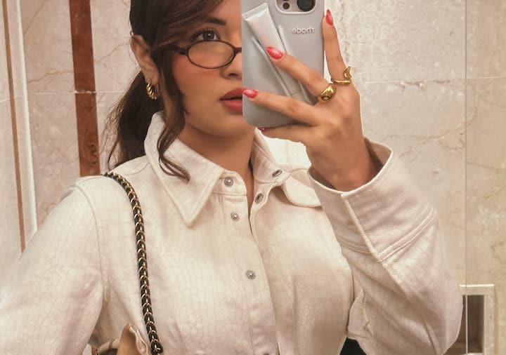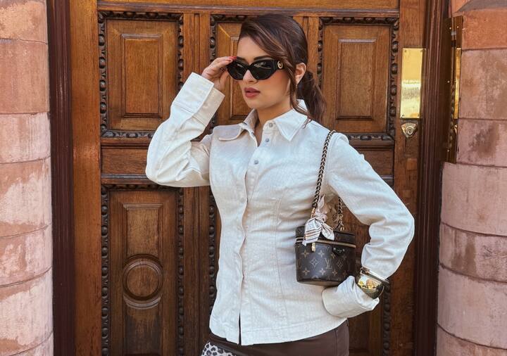 With a low ponytail, Avneet is also wearing a gold watch and bracelet on their left wrist and carrying a brown shoulder bag with a chain strap. She posed fiercely wearing black sunglasses.