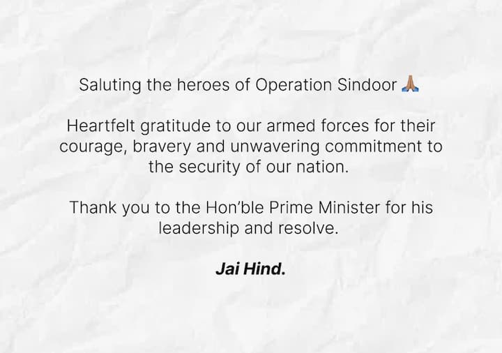 The post read as, “Salute to the heroes of Operation Sindoor. Heartfelt gratitude to our armed forces for their courage, bravery and unwavering commitment to the security of our nation. Thank you to the Honourable Prime Minister for his leadership and determination. Jai Hind.